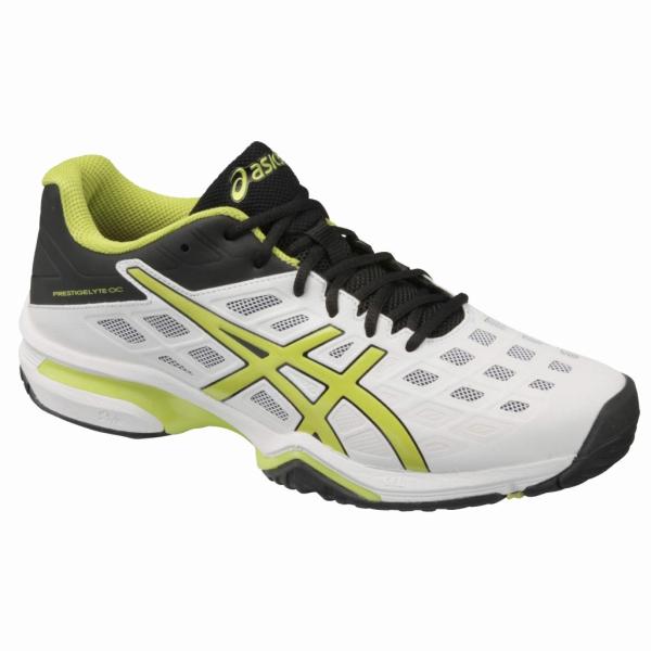 おそらくですが、アシックスのプレステージライトOC。色はホワイト×ライムじゃないかなーと。